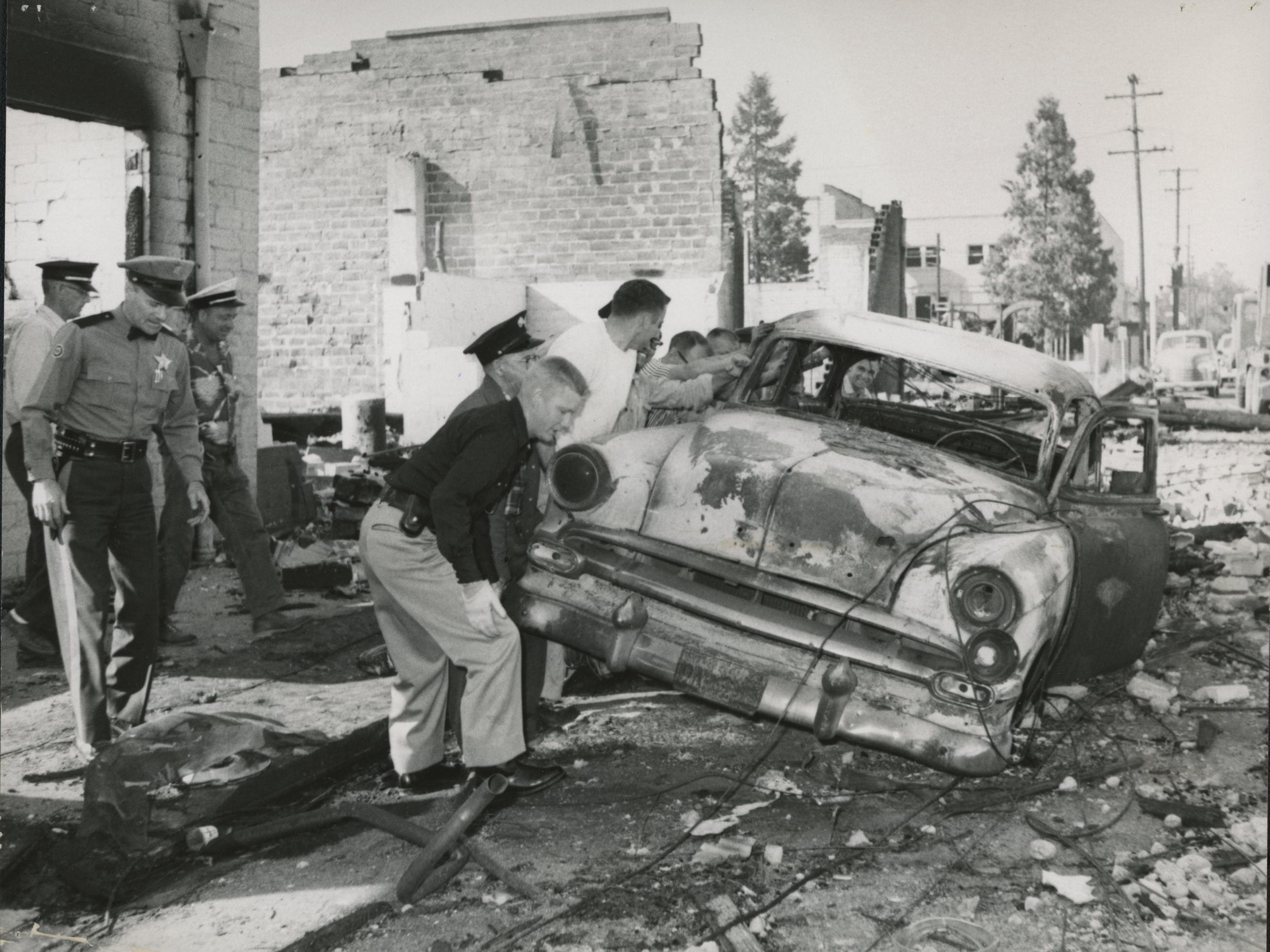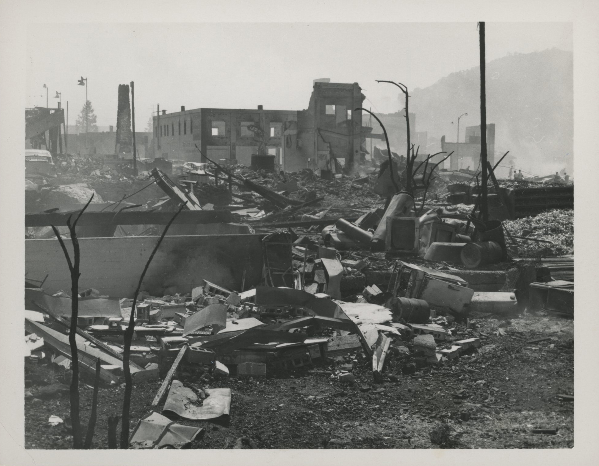 In the early morning hours of August 7, 1959, a parked truck—loaded with two tons of dynamite and over four tons of ammonium nitrate—caught fire outside a supply store on the edge of downtown Roseburg. The resulting explosion, known locally as The Blast, sent a ball of flame and a mushroom cloud of smoke over two thousand feet into the air. A Roseburg policeman described the explosion as looking like "an A-bomb"; a pilot flying over the vicinity at the time actually thought there was a Soviet attack. The Roseburg explosion attracted national attention and resulted in stricter explosives-transport safety regulations and enforcement by the Interstate Commerce Commission.