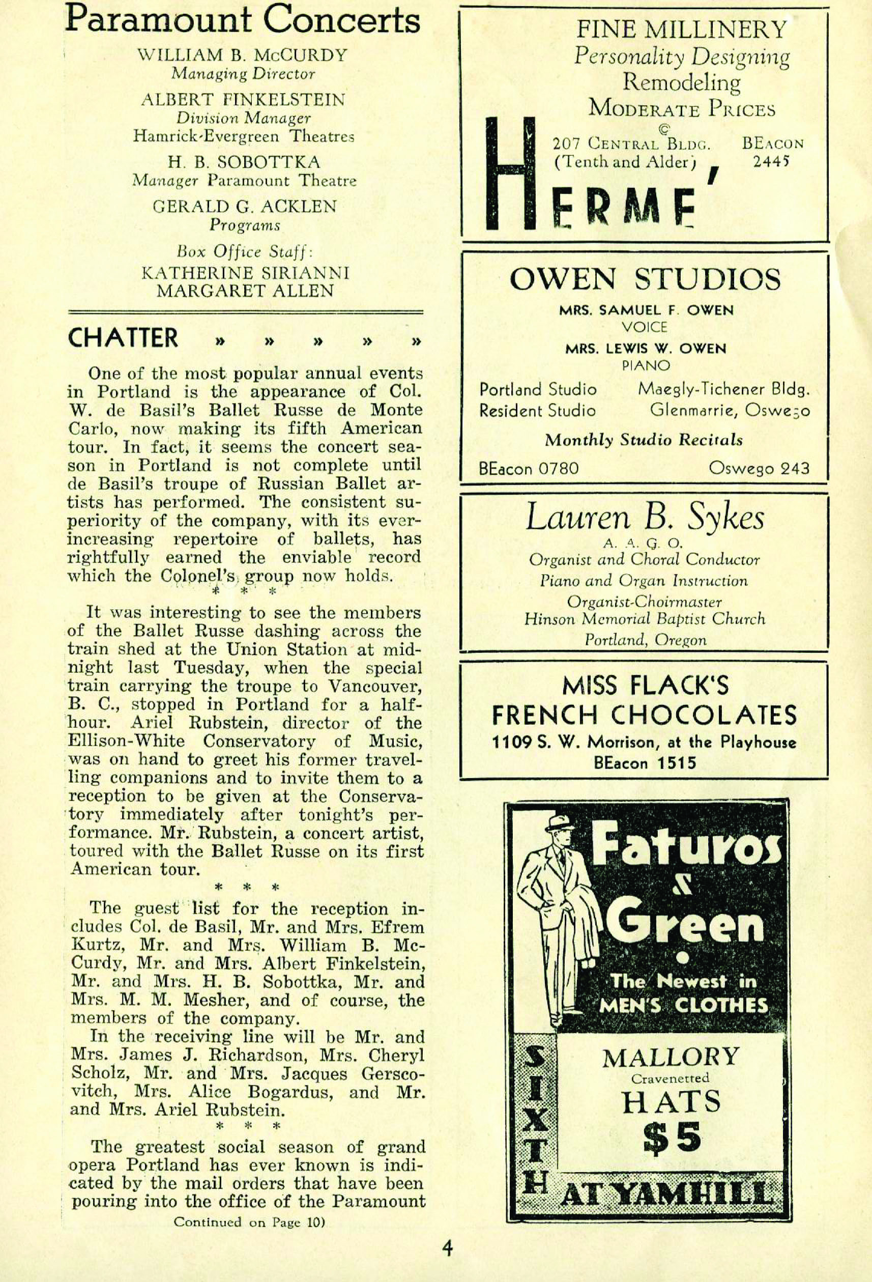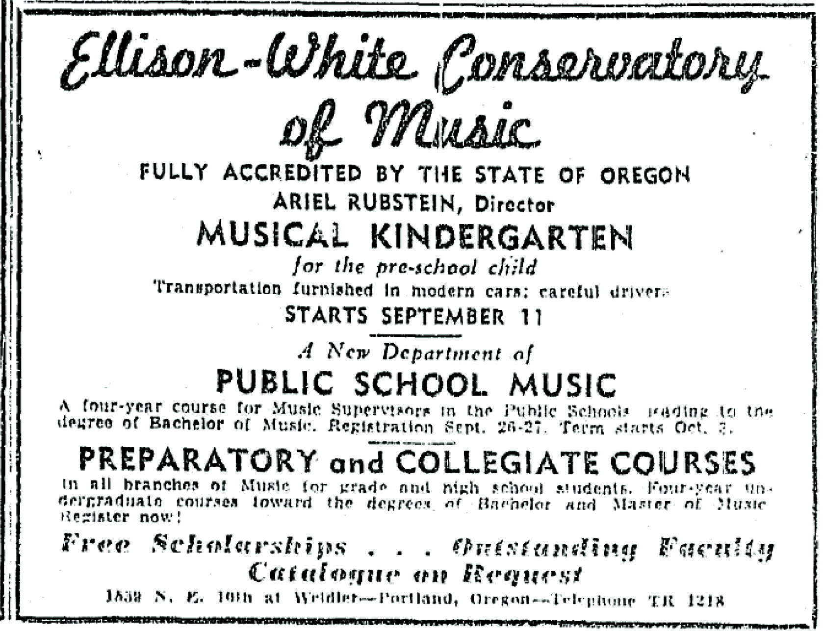 “Conservatory now headed by Ariel Rubstein,” Oregon Journal, August 29, 1937.