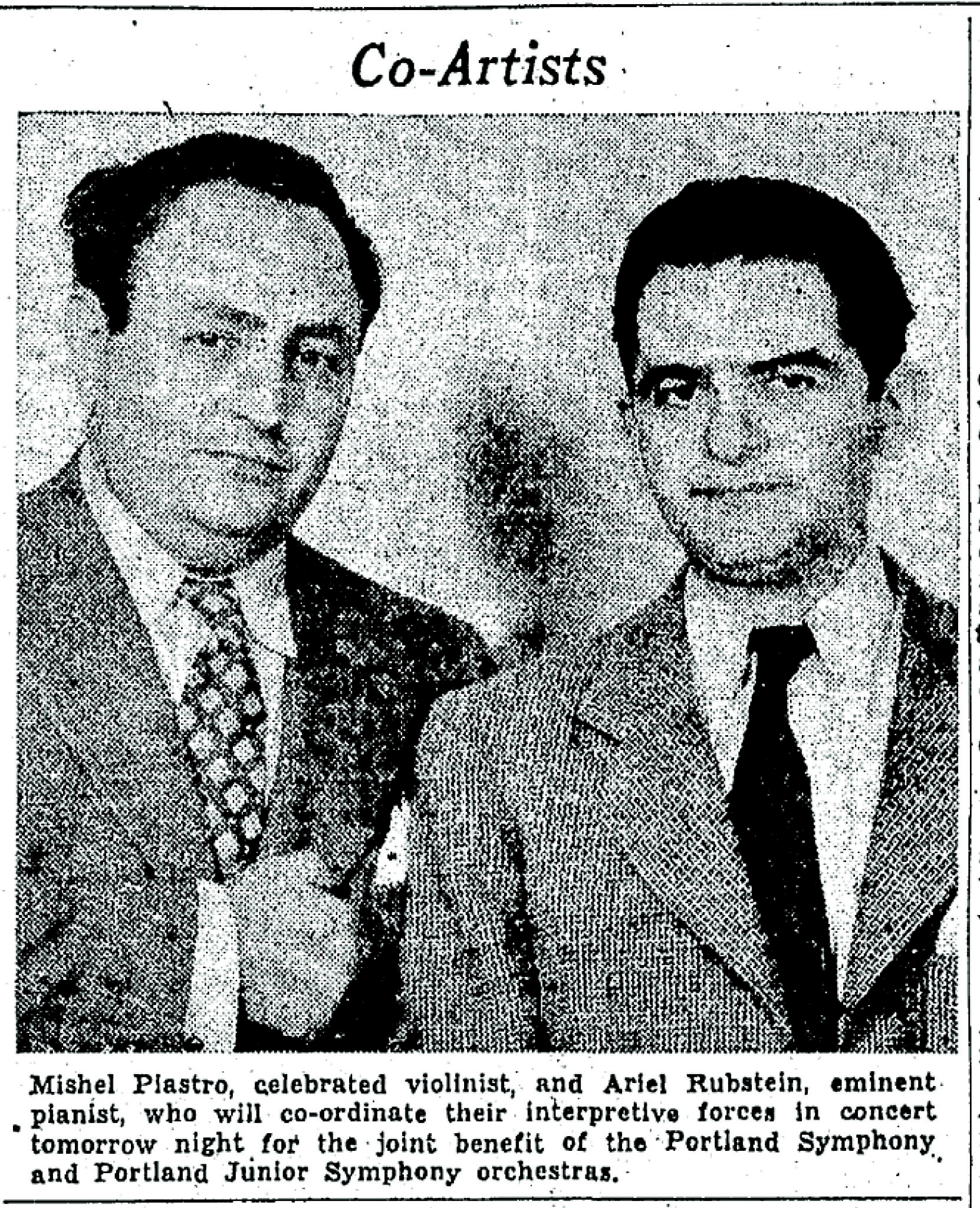 Mishel Piastro and Ariel Rubstein performance announcement in the Sunday Oregonian, September 27, 1936.