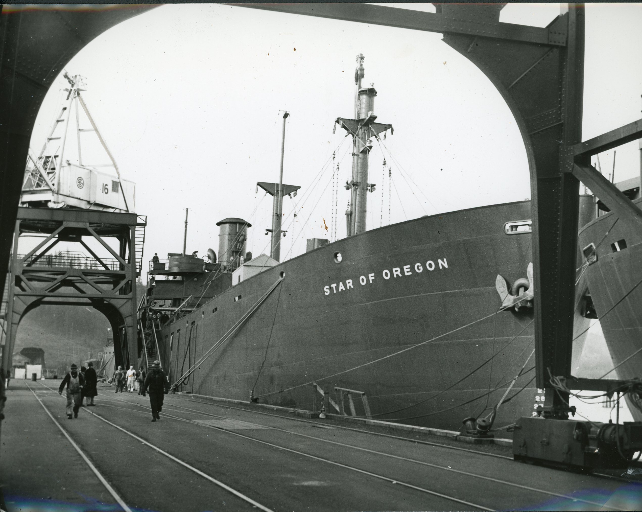 The S.S. Star of Oregon, named for the first ship EuroAmerican settlers had built in Oregon, was one of the few Liberty Ships not named after a deceased person of historical significance. Oregon Governor Charles Sprague and Portland Mayor Earl Riley attended the launch, and Blanche Riley, the governor’s wife, sponsored (or christened) the ship. Immediately upon delivery to the Maritime Commission on December 31, 1941, the commission assigned the Star of Oregon to the States Steamship Company of Seattle for operation.