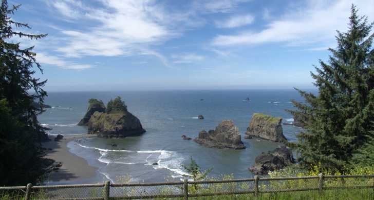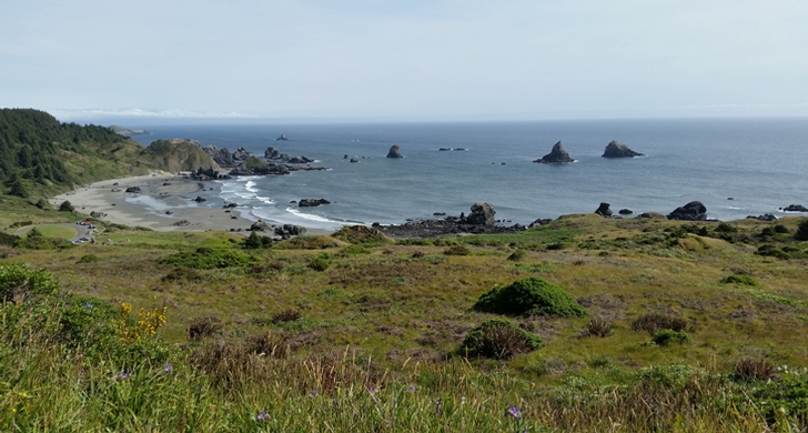 The Samuel H. Boardman State Park is a 1,471-acre, 11-mile, linear park consisting of a stunning swath of coastal Curry County. Stretching west of Highway 101 in a continuous corridor from Brookings north to Pistol River State Park, Boardman State Park (now administratively referred to as a State Scenic Corridor) is one of the most iconic of Oregon’s coastal parks. The park features forested headlands, seaside prairies, shimmering beaches, towering sea stacks, magnificent vistas, and booming surf. The Oregon Coast Trail meanders through the entire park, and Oregon Parks and Recreation Department maintains seven marked trails, ranging from very short to several miles in length. There are also opportunities for informal hikes down to and along the many beaches.