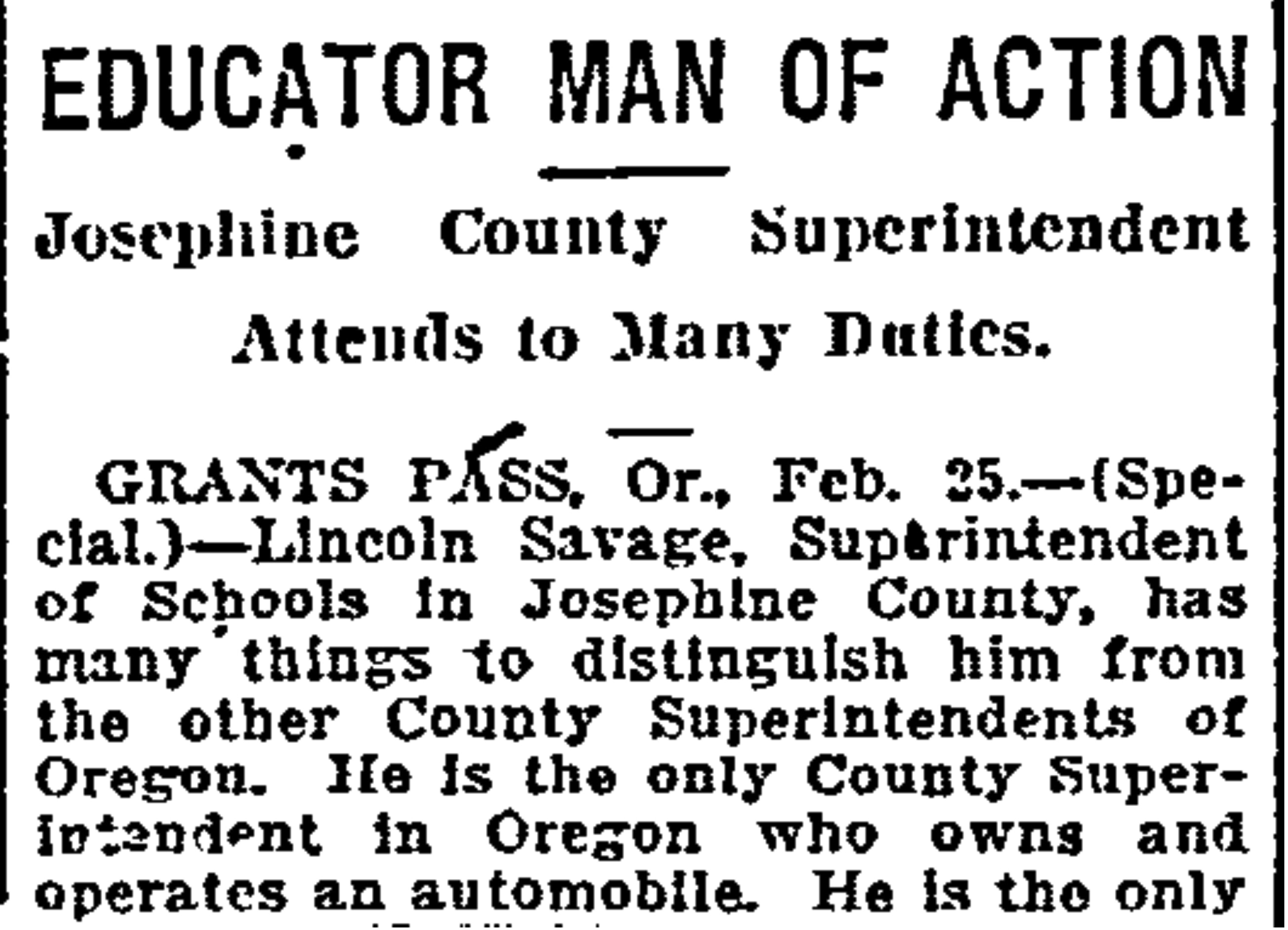 "Educator Man of Action." Article on Lincoln Savage, Sunday Oregonian, Feb. 26, 1912.
