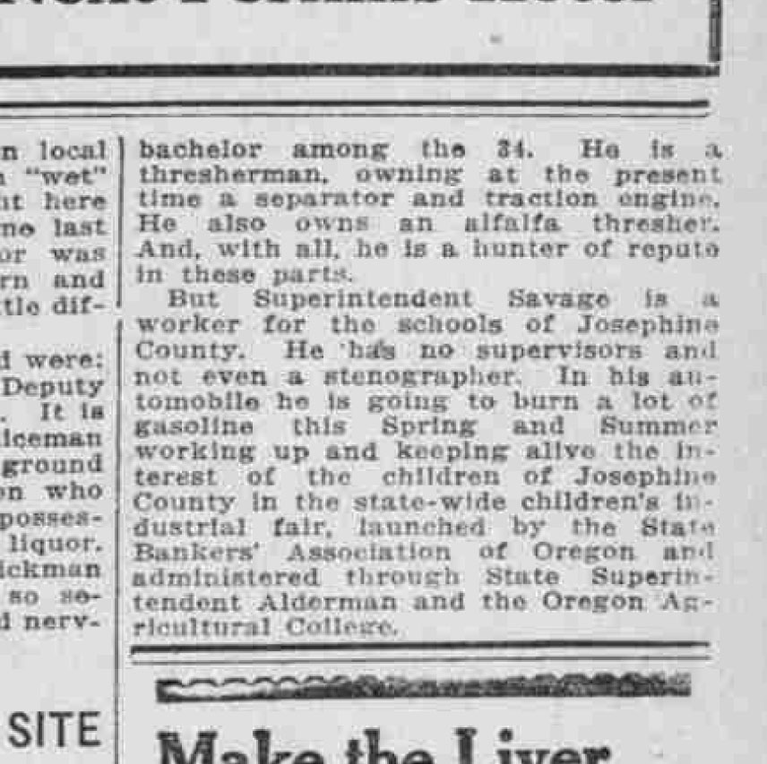 Devoted to education and the study of botany, Savage spent thirteen years teaching in Butte Falls, Ruch, Wilderville, and Kerby and was principal at Ruch, Butte Falls, and Kerby high schools. He was the Josephine county superintendent of schools (1900-1916) and an active member of the State Teachers' Association. He was a strong advocate for a uniform method and course of study, and Josephine County was the first in Oregon to establish such a system. The State of Oregon took up the same plan several years later.