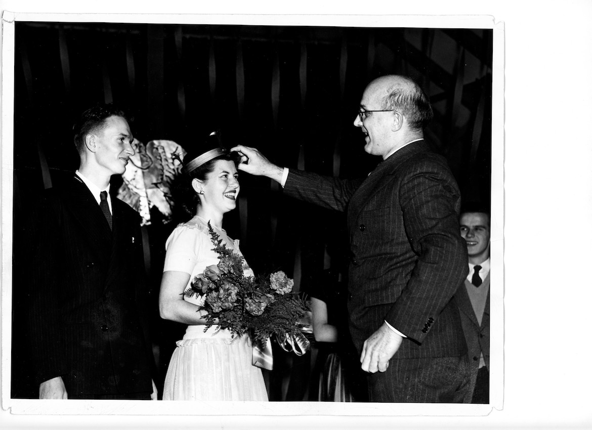Acting President Arthur Scott crowns student Luree Smith [Miller], class ca. 1944..