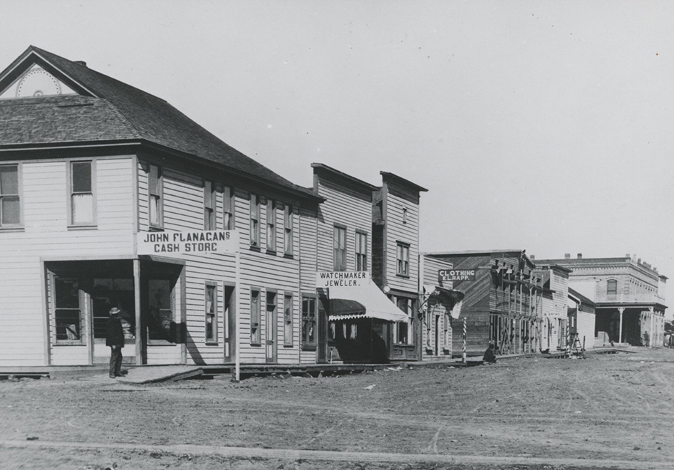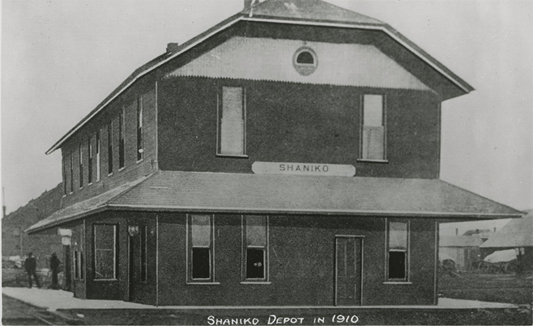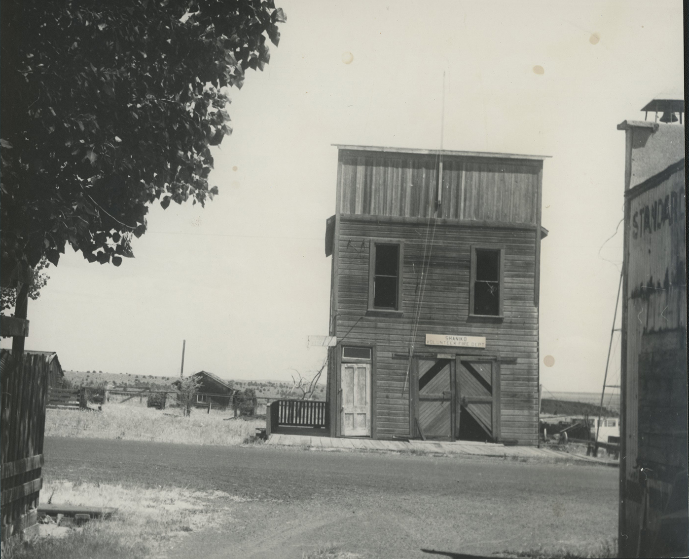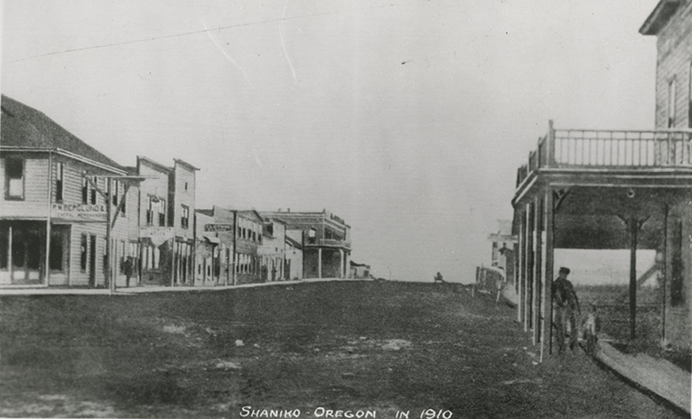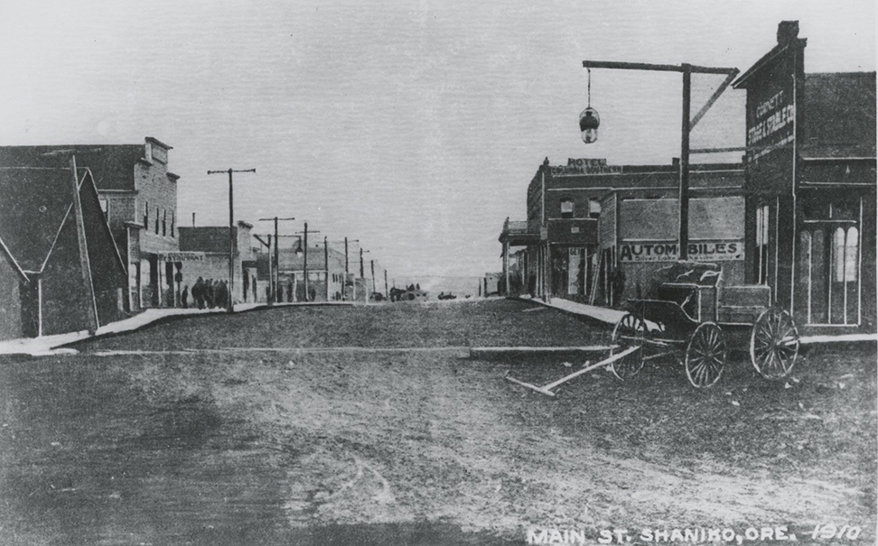 In 1897, the Columbia Southern Railway Company filed papers to build a railroad from Biggs on the Columbia River to Wasco, Moro, and Grass Valley, with a plan to extend the line to Prineville. Businessmen from The Dalles and Moro formed the Townsite Company in 1899 to create a rail terminal between Grass Valley and Prineville, and they laid out streets and a water system for a town near the site of Cross Hollows. By 1900, the year the Columbia Southern came to town, the town’s population was 172. The town, incorporated in 1901, was named Shaniko, after the Wasco Indians’ pronunciation of the name Scherneckau.