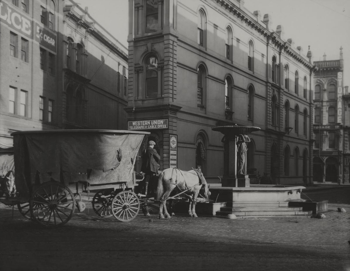 Horse-drawn delivery wagon next to Skidmore Fountain, c.1890.