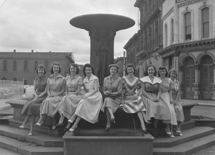 Portland Rose Festival Princesses at first meeting in front of the Skidmore Fountain, May 20, 1952.