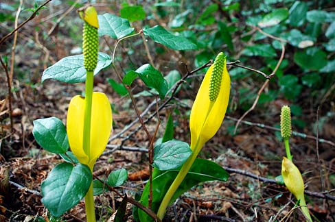 Skunk cabbage (Lysichiton americanus), which grows in mucky soils and marshes from northern California to Alaska, is one of the few members of the Arum (Araceae) family native to the Pacific Northwest. Its flowers (on the clublike stalk) and surrounding bright yellow spathe emerge as early as February, soon followed by the emergence of waxy dark green leaves. The flowers emit an odor that gives them their common name—not exactly skunklike, but strong and distinctive, which some people find unpleasant. On average, a skunk cabbage plant begins to set seed at five years of age and can live up to twenty years. The plants primarily reproduce by seed, which is dispersed by animals or running water.