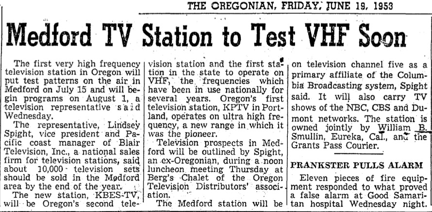 Medford TV Station to Test VHF Soon Oregonian article, June 19, 1953.
