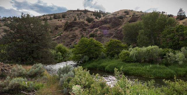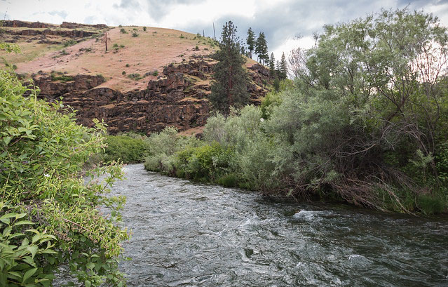 From its headwaters in the fir and ponderosa pine forests of Grant and Harney Counties, the South Fork John Day River flows northward for about sixty miles to the river’s main stem near Dayville, carving a corridor through the rocky basalt, rangeland, and western juniper woodland of the far south Columbia Plateau in central Oregon. With the majority of its length designated an Oregon scenic waterway and a national wild and scenic river, the South Fork provides important habitat for fish and wildlife, including summer steelhead and bighorn sheep, and serves as a gateway to recreational activities managed by state and federal agencies.