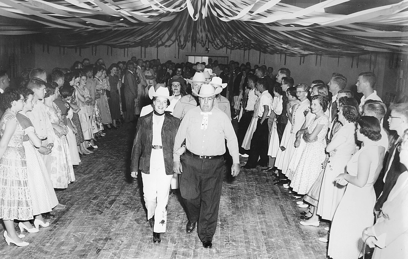 In 1935, eight St. Paul farmers and businessmen decided to “support our greater community and honor our western heritage” by establishing a rodeo to help the economically depressed area. They cleaned up the town’s city park and erected seating, four bucking chutes, and a roping chute. The first year, fifty cowboys from around Oregon participated. To promote the rodeo, a royal court was established in 1937 with a queen and two princesses, who were required to have their own horse and equipment. The grandstand, originally built in 1956 and remodeled several times, seats 10,500 people. The arena, located on city land and leased under a special arrangement, is a year-round structure owned by St. Paul Rodeo, a nonprofit corporation. A parade is held on the Fourth of July.
