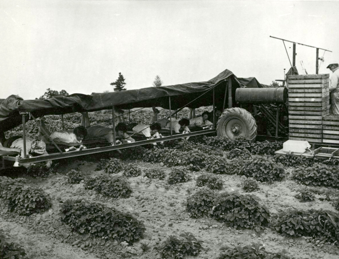 ![]()  Workers use a special farm machine to harvest crops in St. Paul, 1962. Courtesy Oregon Hist. Soc. Research Lib., Orhi85262