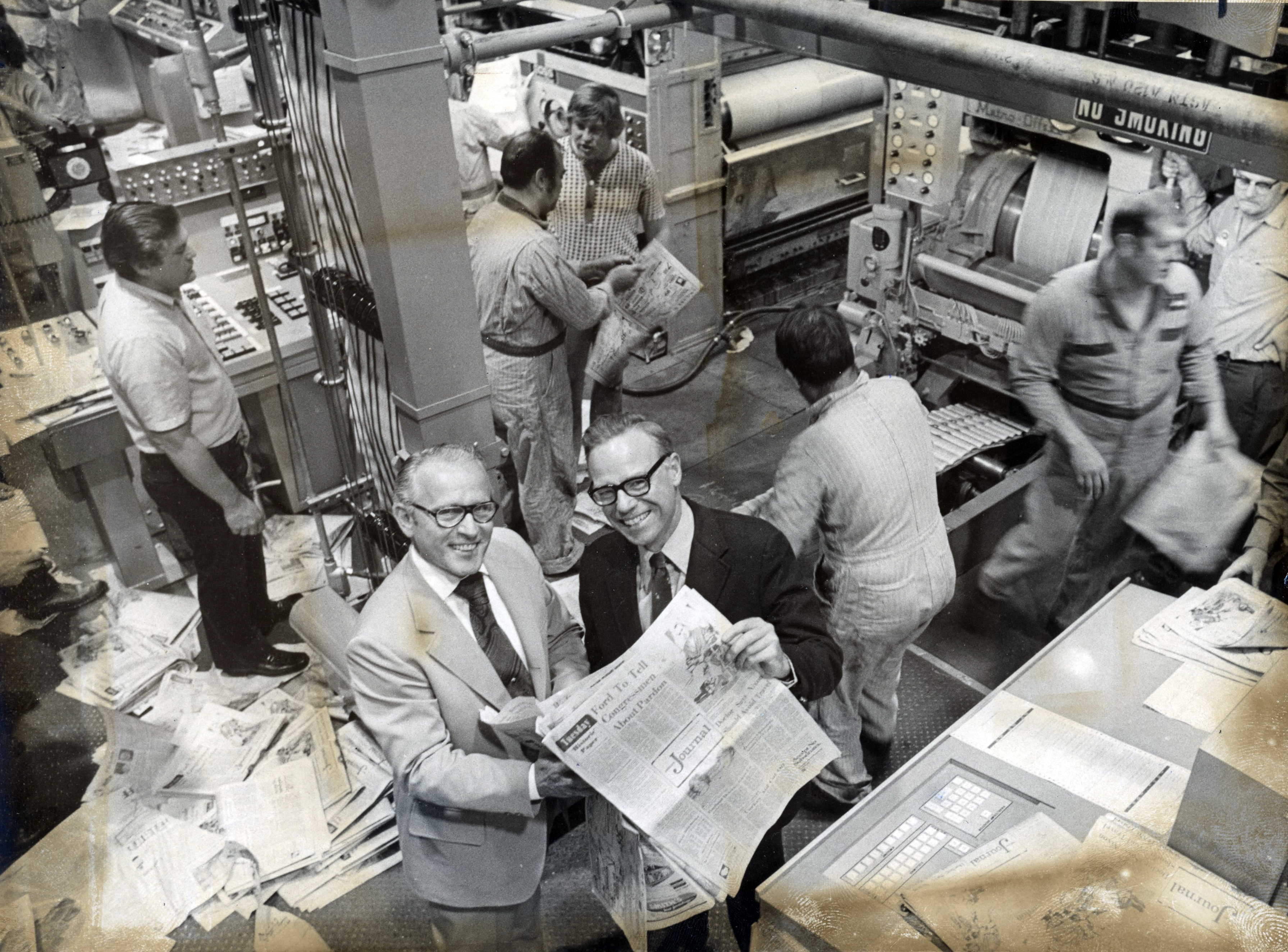 Fred Stickel and Donald Sterling, Jr., pose with the first edition of the Oregon Journal to be printed at the new Oregonian plant, October 2, 1974.