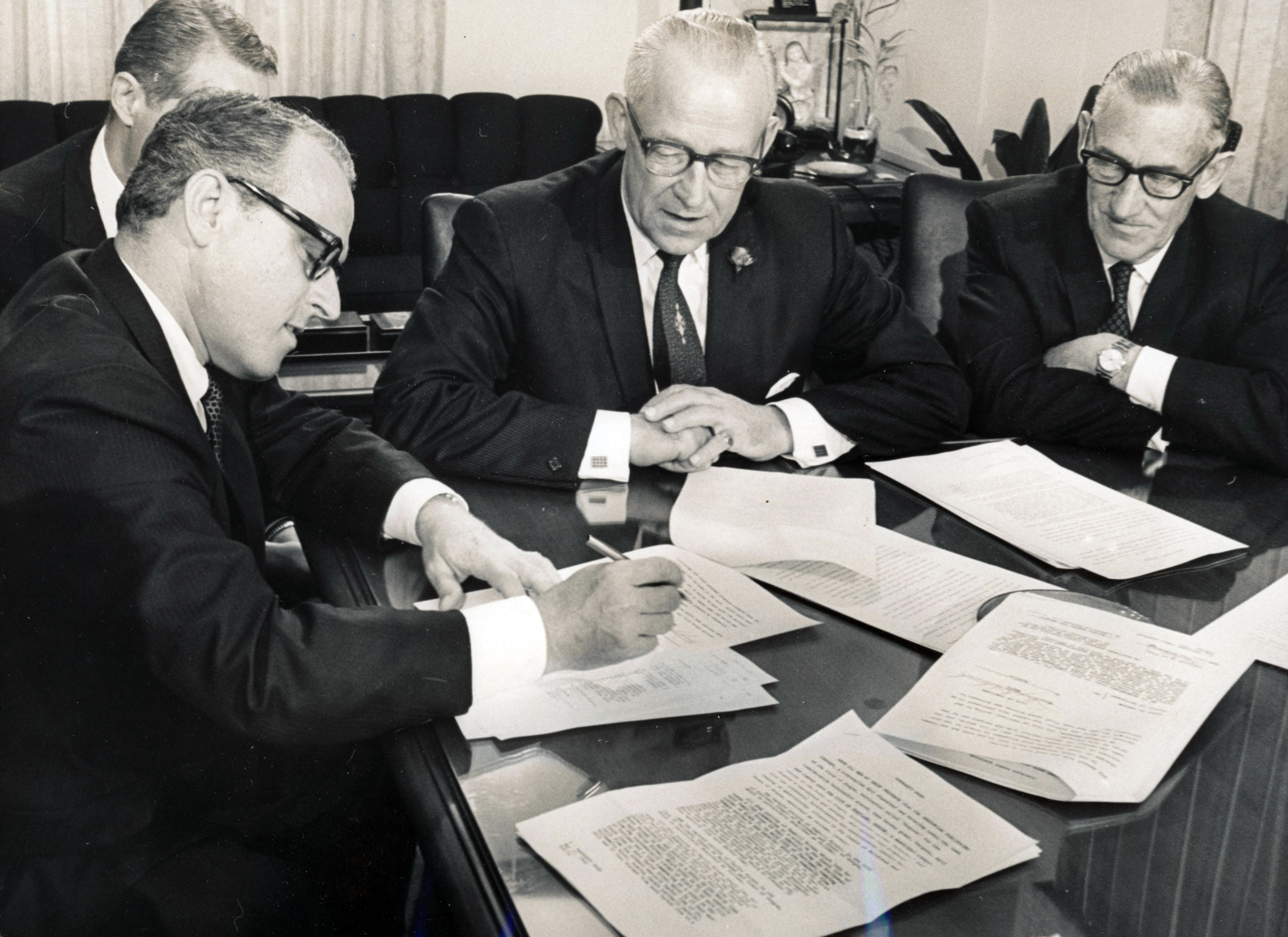 Fred Stickel, Mayor Terry Schrunk, and Glenn Jackson sign for the city and state purchase of the Journal Building on Harbor Drive, June 1968.