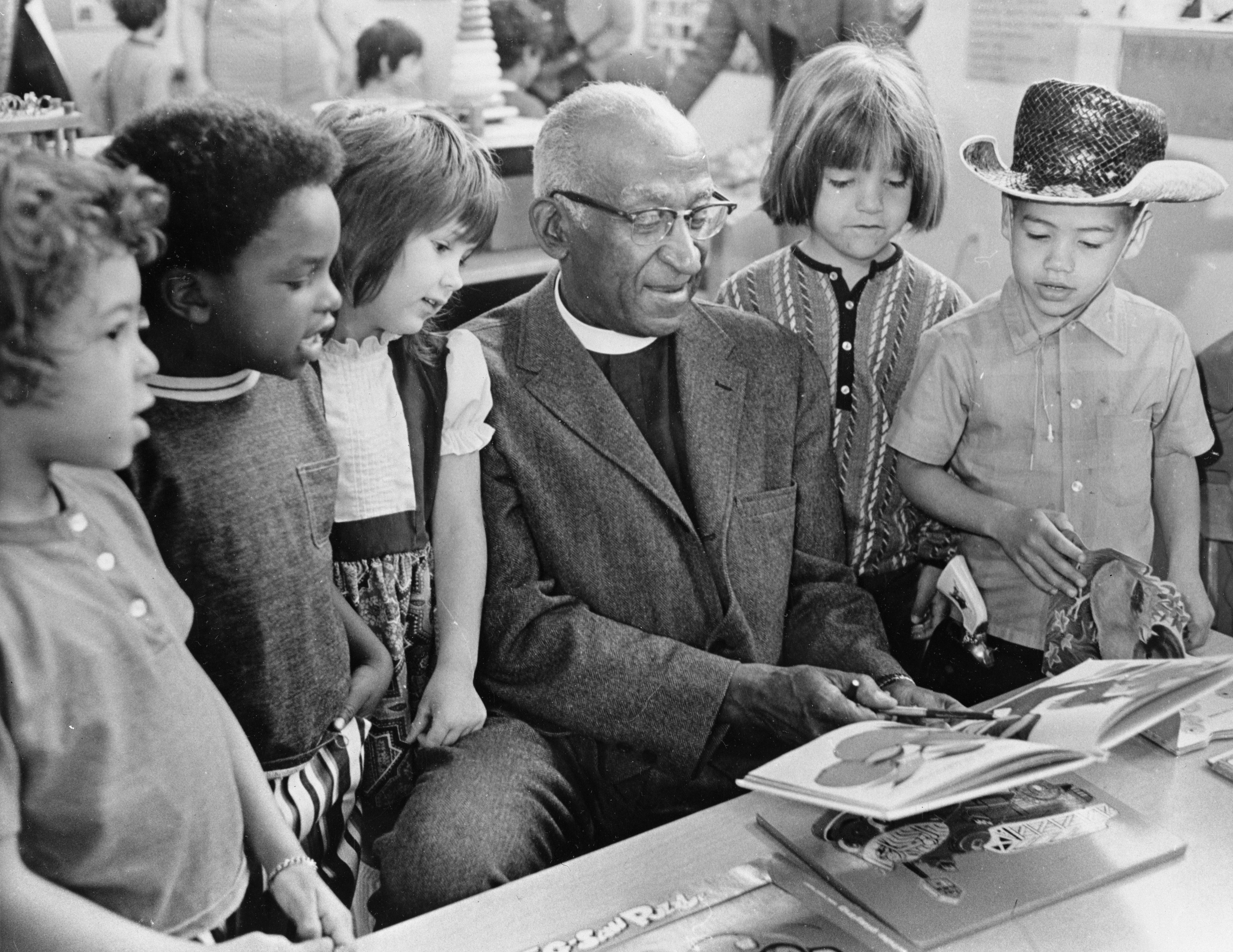 Rev. Lee Owen Stone reads to children at the Lee Owen Stone Co-operative preschool, 1972.