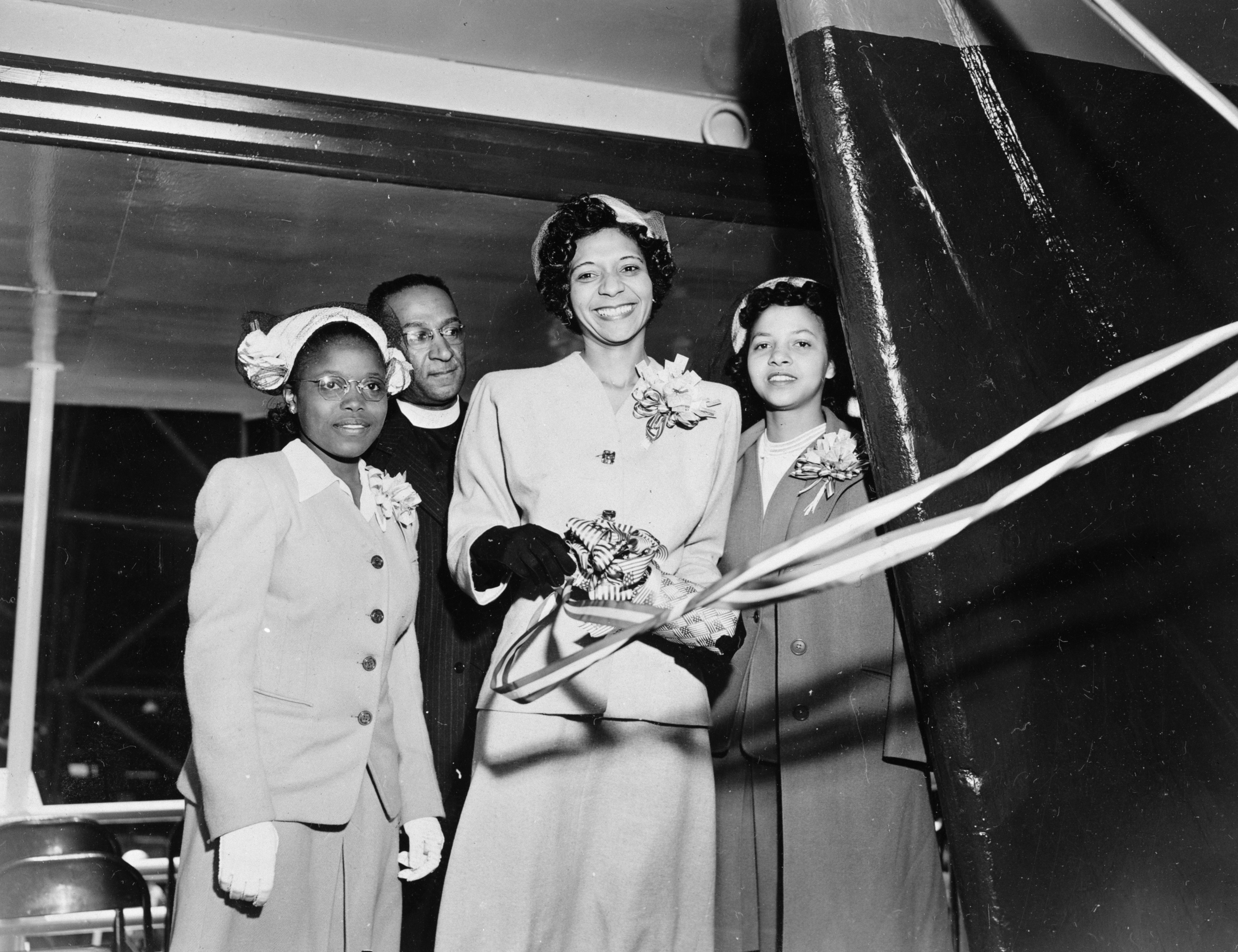 Dorothy Crockett, Rev. Lee Stone, Charlotte Moton, and Bennie Gragg at launching of Tuskegee victory ship, 1945.