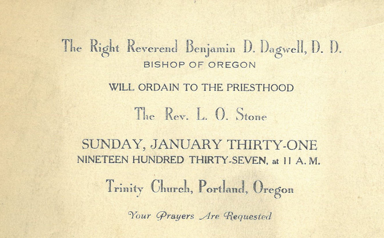 After a short period of trial service at St. Philip the Deacon Episcopal Church, located at that time on NE Rodney Street, Bishop Dagwell ordained Stone in early 1937. St. Philip was founded in 1911 by congregates from the Caribbean (mostly either Barbados or the Virgin Islands), who were temporarily using St. Stephen’s Cathedral in downtown Portland for services.