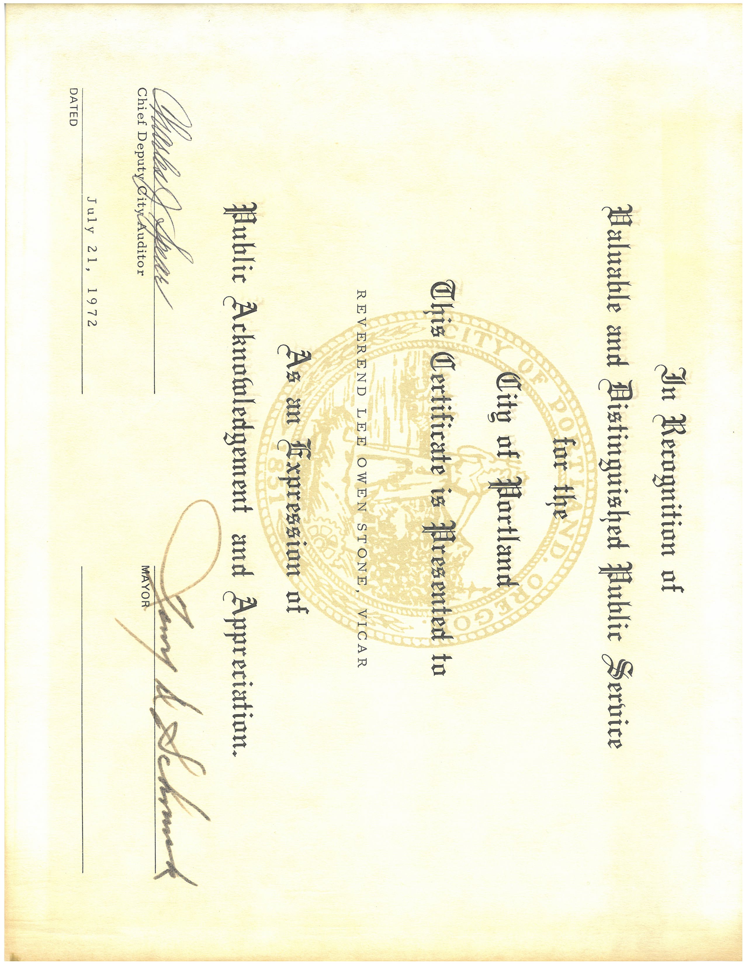 City of Portland Award Certificate honoring Rev. Lee Owen Stone, 1972.