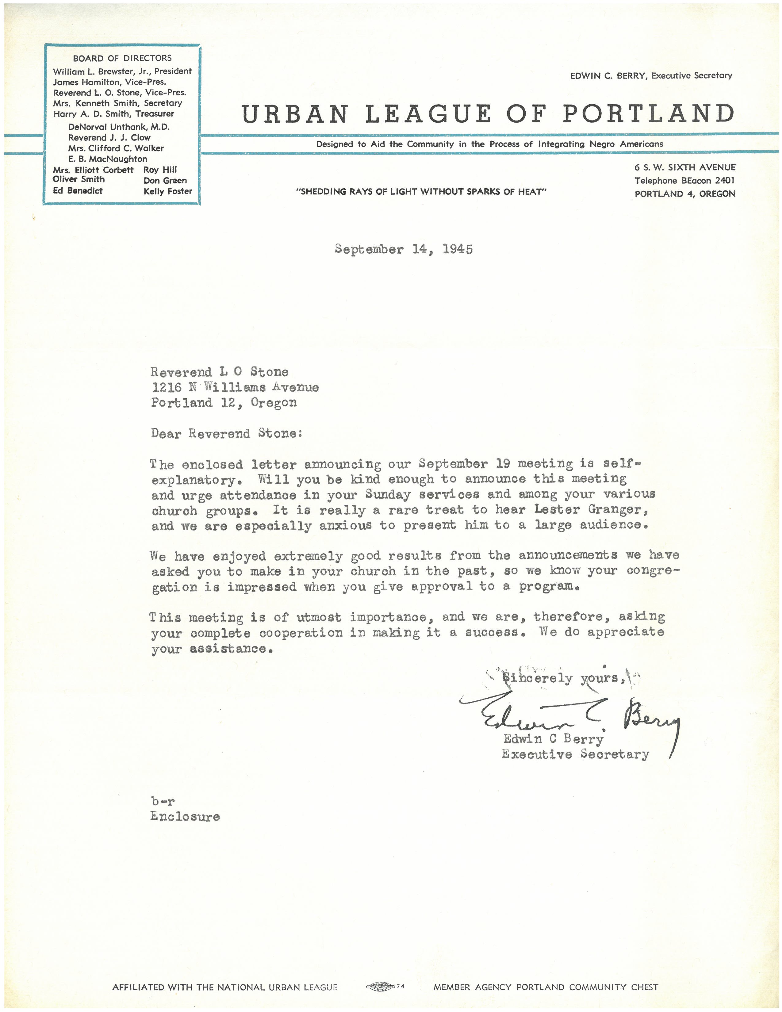 Letter from Edwin C. Berry from the Urban League of Portland promoting talk by National Urban League executive secretary, Lester Granger, 1945.