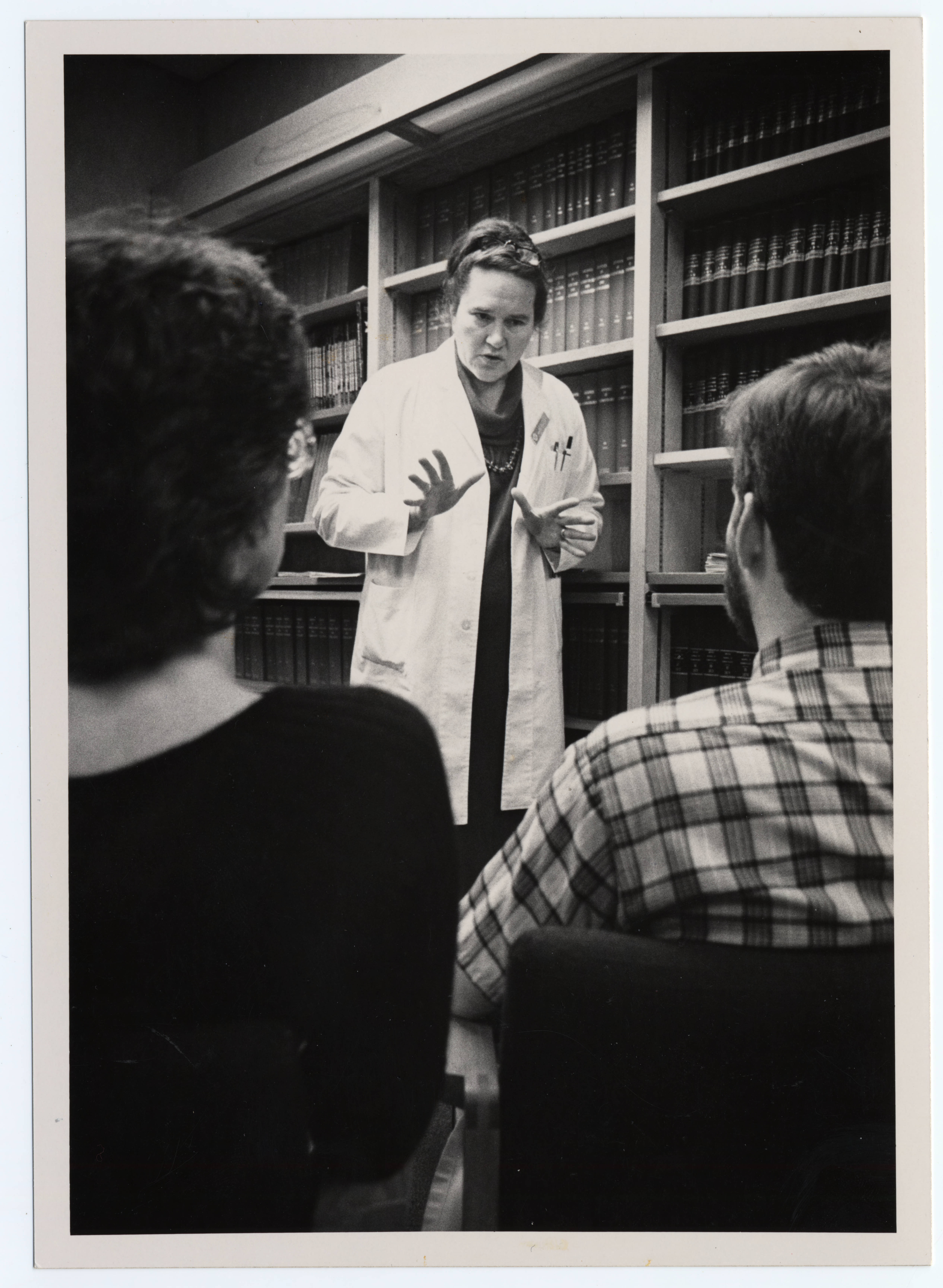 Frances J. Storrs, M.D., teaching students in classroom, 1965.