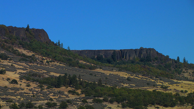 The base of the mesas is composed of sandstone, conglomerate, and other sediments from ancient rivers, part of the Payne Cliffs Formation that is between 48 and 34 million years old. These sediments have been protected from erosion by the Rocks’ lava cap, formed 7 million years ago when a shield volcano erupted some forty-four miles upstream on the upper Rogue River, near present-day Lost Creek Lake. From there, molten lava flowed down the ancestral Rogue, spreading over what are now parts of the northernmost Rogue Valley. The easternmost exposures of the lava are near Lost Creek Reservoir, and the westernmost outcrop forms Castle Rock, just west of Lower Table Rock.