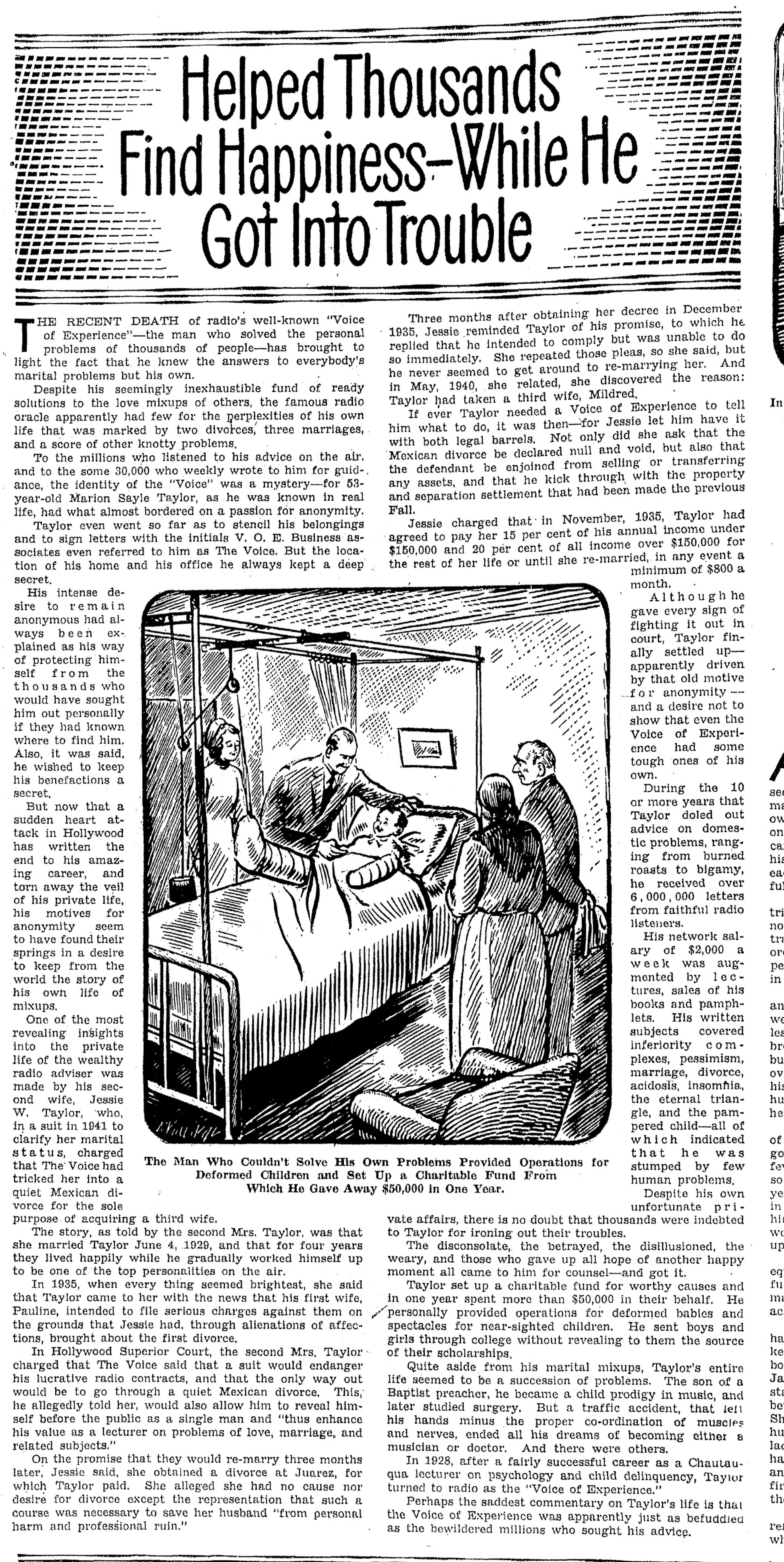 On February 1, 1942, Taylor suffered a heart attack and died in Hollywood, Los Angeles. His family received a small life insurance policy, and creditors claimed the $23,000 he left as assets. The Oregonian detailed Taylor’s many deceptions in an article published after his death, ending with: “The Voice of Experience was apparently just as befuddled as the bewildered millions who sought his advice.”