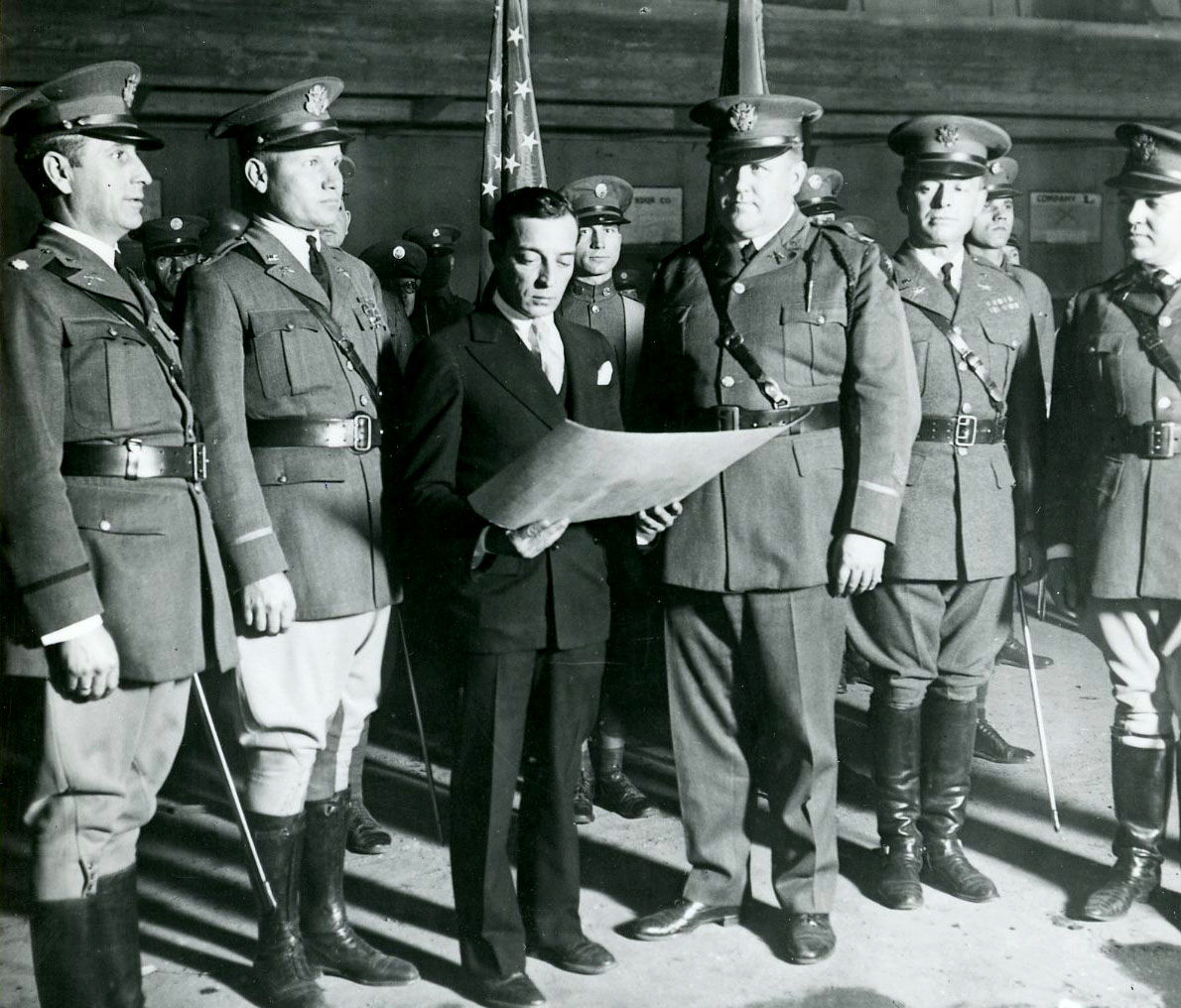 ![]()  Buster Keaton was made a captain in the Oregon National Guard, 1927. Guardsmen were used as extras in "The General.". Courtesy OR Hist. Soc. Research Library, 011083