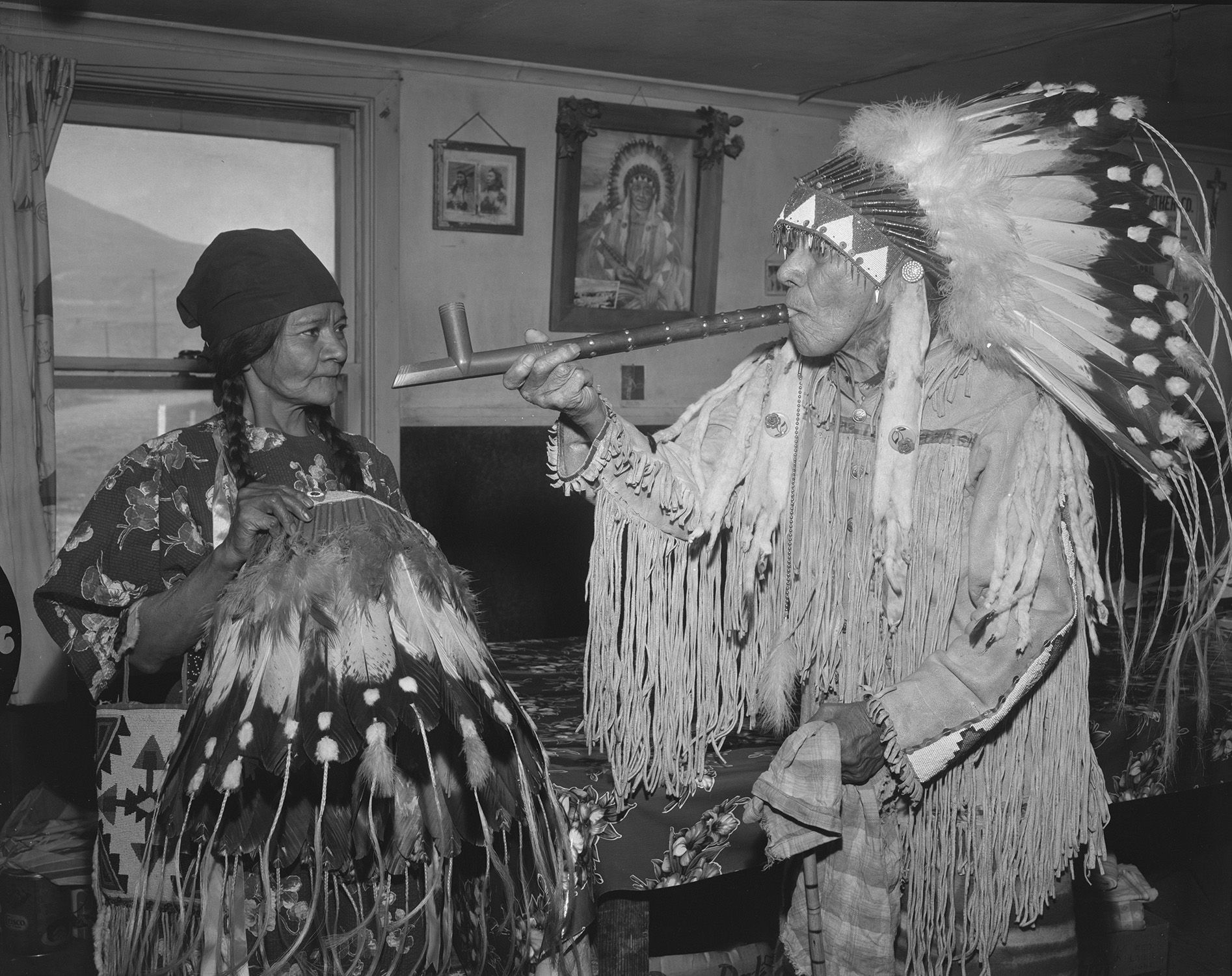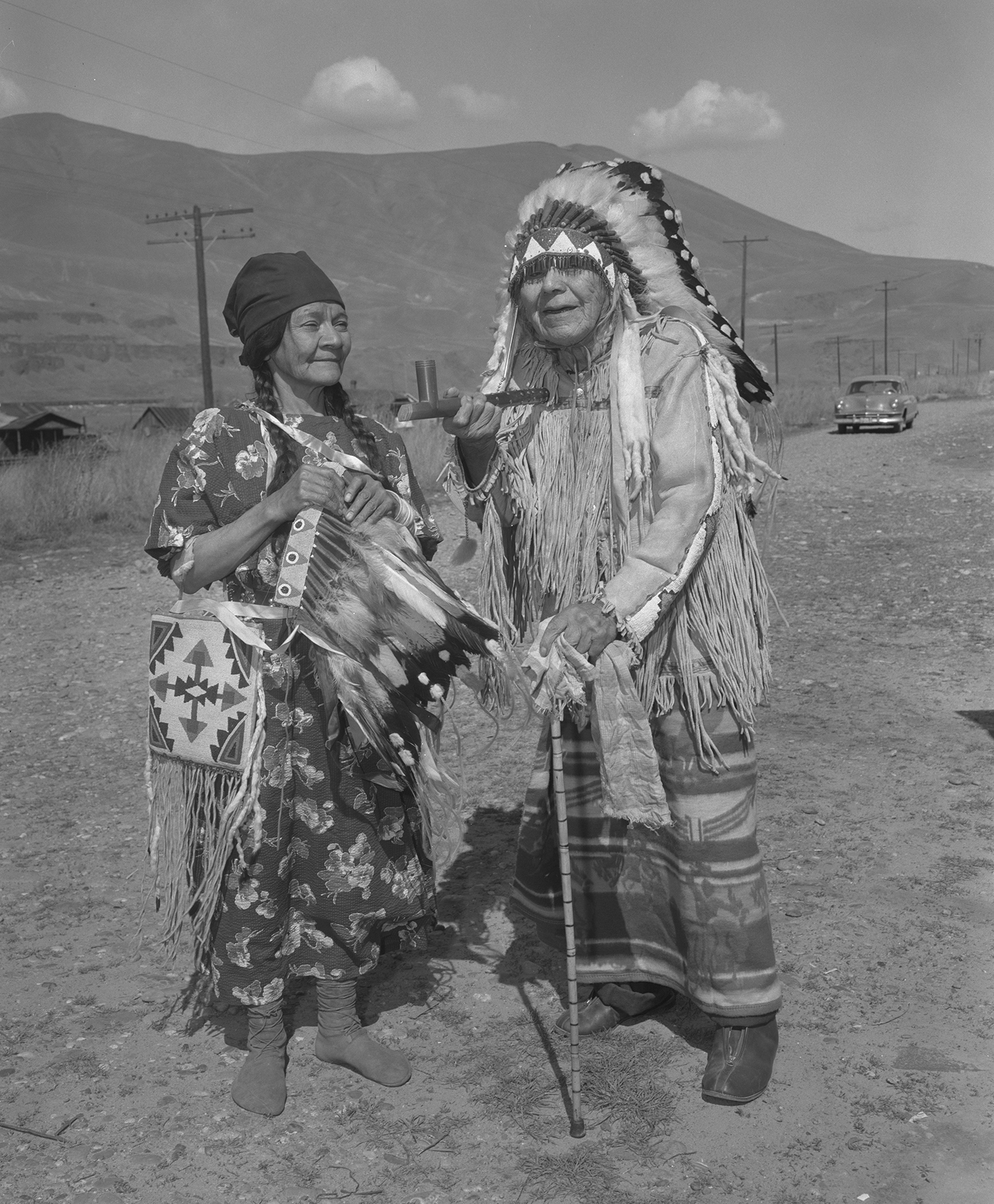 Flora Thompson and Chief Tommy Thompson, Celilo Village, 1955.