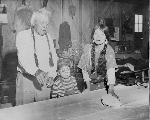 Flora Thompson with Charlie Tuitalkin, Marshall Dana, and Tommy Thompson, Chiefs Island, 1949.