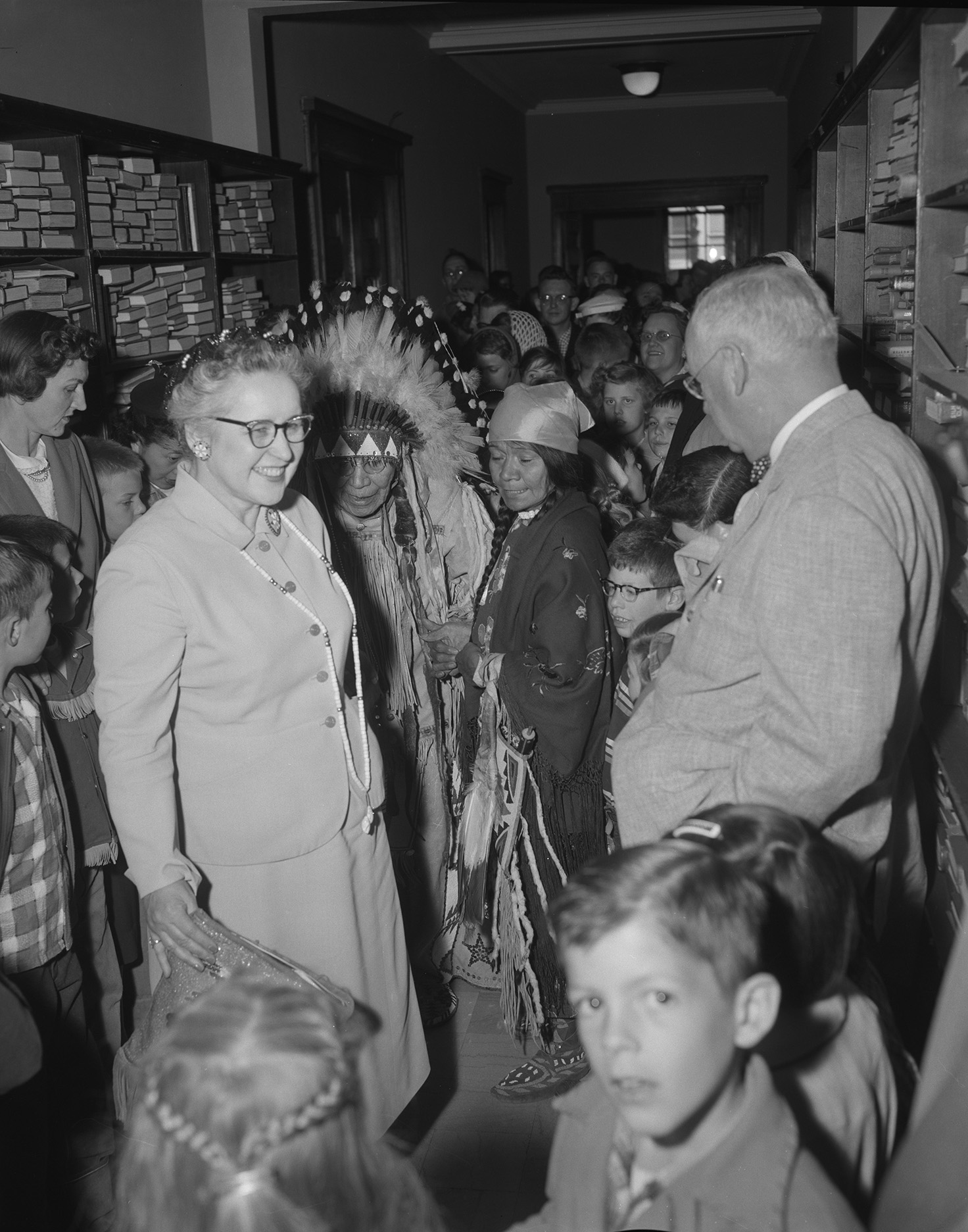 Martha Ferguson McKeown, Chief Tommy Thompson, and Flora Cushinway Thompson, 1956.