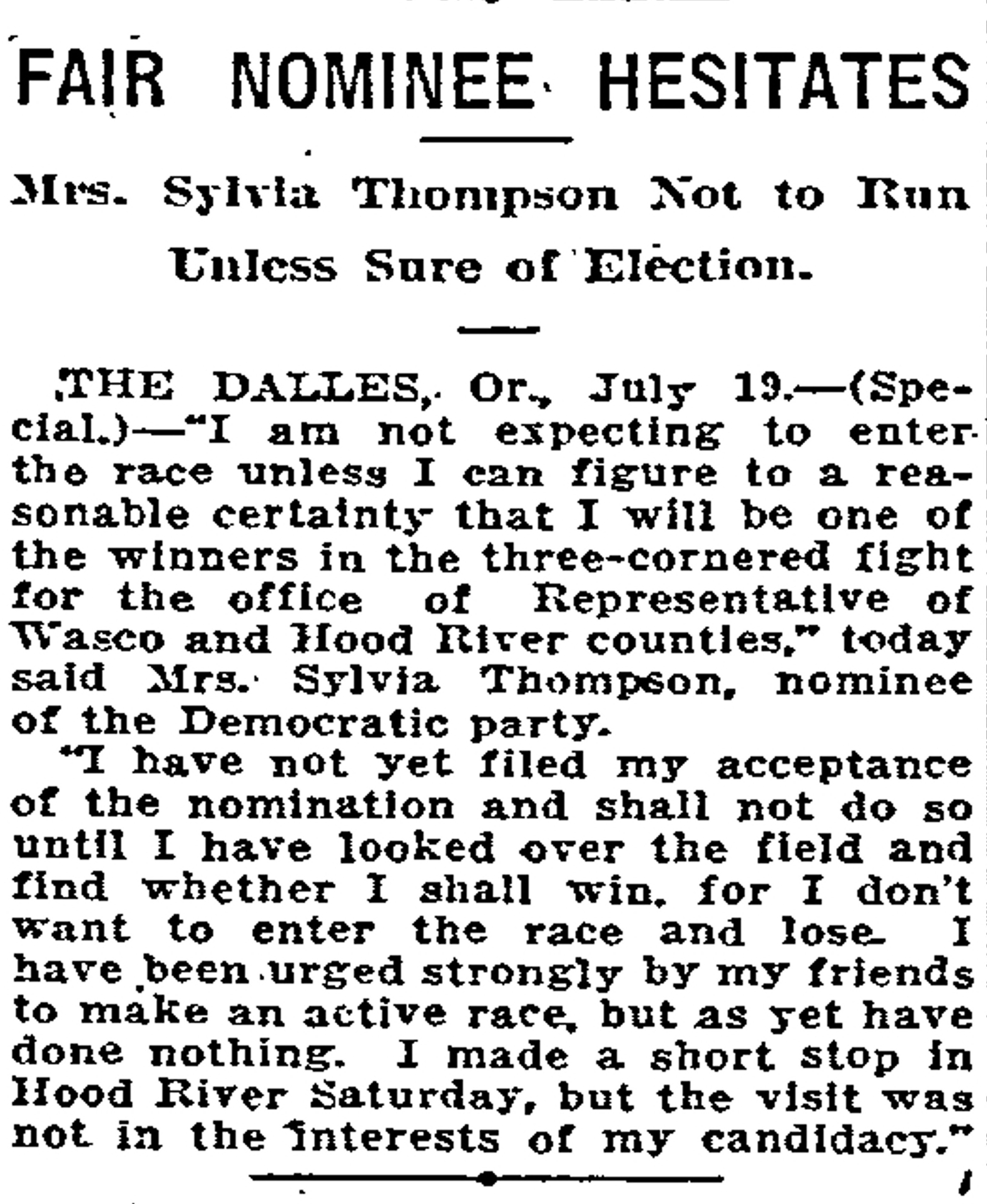 "Fair Nominee Hesitates. Mrs. Sylvia Thompson Not to Run Unless Sure of Election," Oregonian, July 20, 1916.
