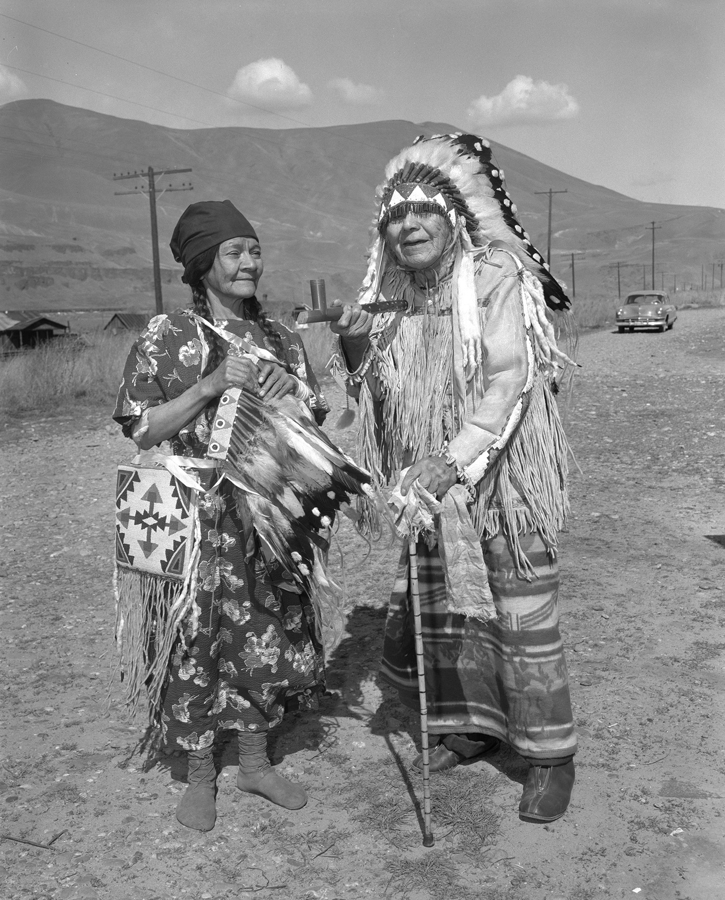 Chief Tommy Kuni Thompson and Flora Cushinway Thompson, Celilo Village, 1955.