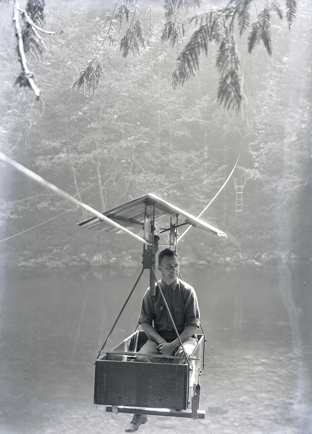A man rides a "baby buggy" across the Clackamas River at Three Lynx, 1922.