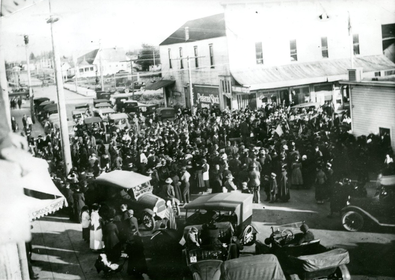 Members of a Ku Klux Klan klavern organized in Tillamook in the early 1920s. For ten years, from 1922 to 1932, historian Eckard Toy wrote, “the majority of municipal, county, and state officials from Tillamook were Klansmen or former Klansmen.” Local organizations such as the Masonic Lodge, the Odd Fellows, the Royal Order of the Elks, and the American Legion were fertile ground for recruitment and infiltration. The editor of the Tillamook Headlight, an avowed Klansman, bragged in his newspaper that the town was homogenously white. On May 3, 1924, the Klan held a rally in Tillamook, attended by thousands of people who watched a parade ten blocks long. The parade ended with the burning of a large cross at the fairgrounds and initiation of new members.