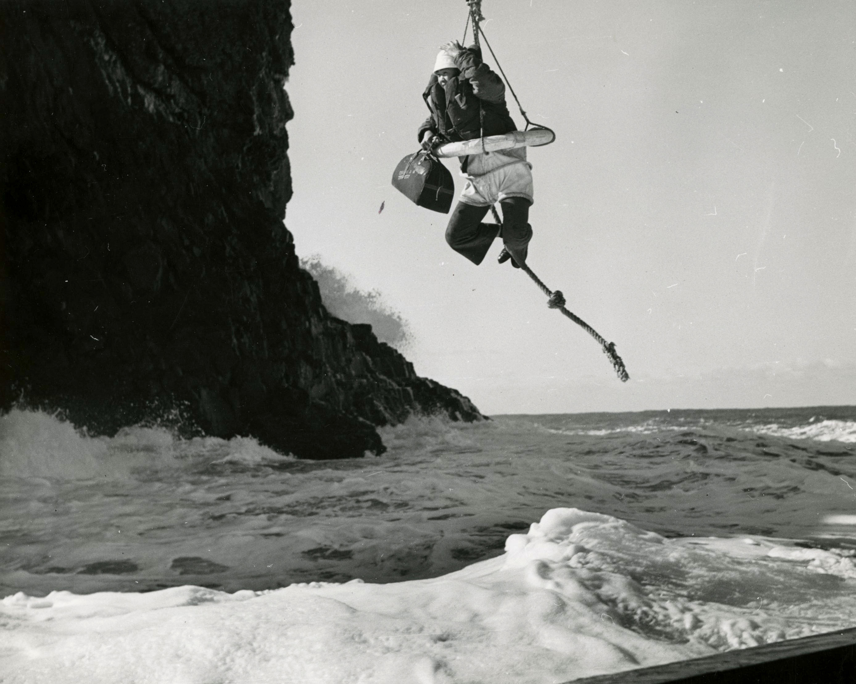 Duty at Tillamook Rock meant isolation, punishing storms, and a hazardous environment. Supplies were often delayed for days or even weeks, and communication was possible only by telegraph via an underwater cable to Indian Beach at present-day Ecola State Park. Monstrous storms often battered the Rock, contributing to the lighthouse’s nickname, Terrible Tilly. During a gale in October 1934, for example, winds of over a hundred miles an hour pounded the coast. Waves surged over the tower, shattering the Fresnel lens, and the battered lighthouse became a shambles of ruined equipment and flooded rooms as boulders crashed into the building. The telegraph cable was severed, and all of the landing gear was carried away. The keepers finally made contact with the mainland using a code-sending transmitter cobbled together of spare parts by keeper Henry Jenkins.