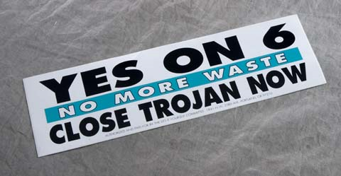 "Yes on 6 Close Trojan Now" bumper sticker, 1992.