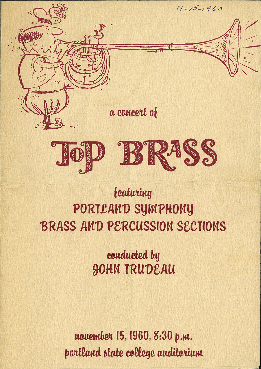 Simeon John Trudeau Jr. was a major contributor to the musical life and culture of twentieth-century Oregon. A musician, conductor, and teacher, he was a founder of the Britt Music Festival in Jacksonville, the Portland Pops Orchestra, and the Portland Brass Ensemble. He was an advocate for the arts, especially classical music, and made significant and long-lasting changes to Portland State University’s School of Music.