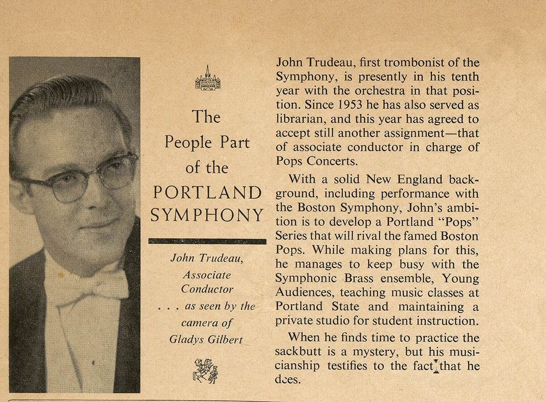 The son of Simeon John Trudeau and Adelina Beatrice Chapman, Trudeau was born in Salem, Massachusetts, on February 26, 1927. After serving in the 392nd Army Band during World War II, he entered the New England Conservatory of Music, where he graduated cum laude with a degree in trombone performance and orchestral studies. He married Elizabeth Odom in Woburn, Massachusetts, on September 5, 1949. Trudeau joined the Portland Symphony (today’s Oregon Symphony) as principal trombonist in 1951 and was appointed associate conductor in 1959 under conductor Rouben Gregorian. While in that position, he founded the Portland Pops Concerts, modeled on his experiences with conductor Arthur Fiedler and the Boston Pops.