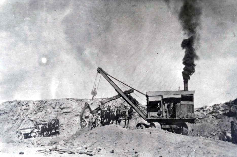 Steamshovel digging fill materials for dam.