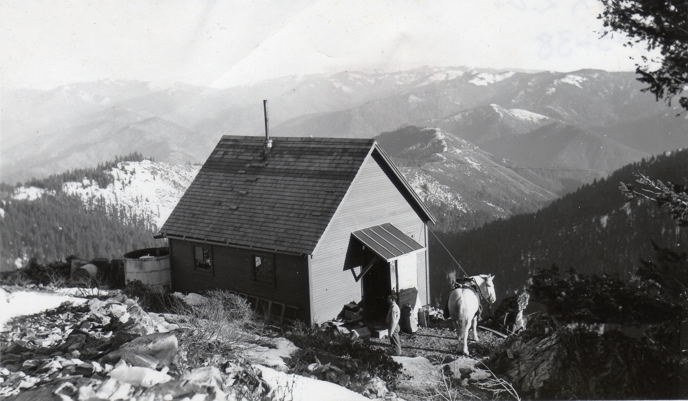 A 14-by-14-foot lookout building perched on the summit next to a near-vertical 600-foot drop to Low Gap Creek, the lookout became winter quarters for Two-Bits's owner, Bill Zeigler, and another AWS man. Their task at Whisky Peak, which was in a rugged and remote portion of southeastern Josephine County, was to report to the army by means of crank telephone any aircraft heard or observed. Forest Service crews on skis delivered food and other supplies to the pair every two weeks. Two-Bits spent his days at Whisky Peak chasing the chipmunks that begged for food.