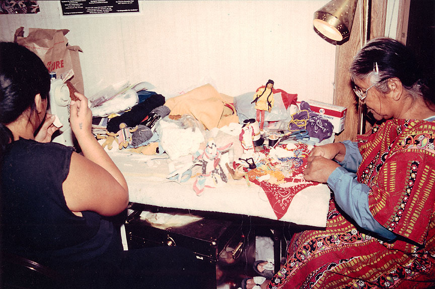 Mary Ann Meanus (Wasco) teaches Rhonda Arthur (on left) traditional doll-making, 1991.