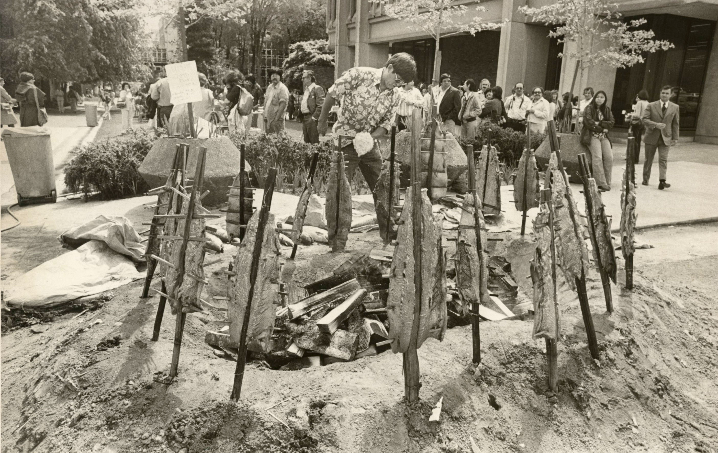 Salmon bake at Portland State University, organized by the United Indian Students of Higher Education, 1977.