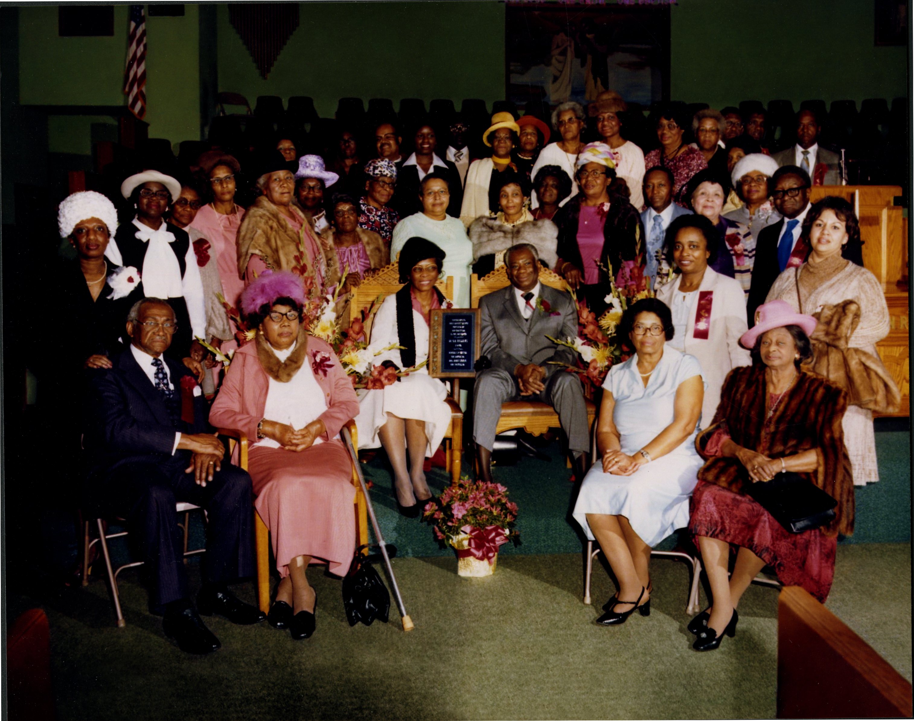 Rev. O.B. Williams and his congregation at his 30-year anniversary party, 1975..