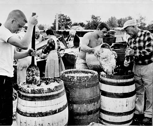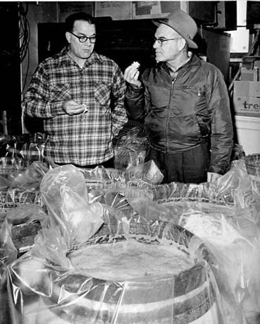 Father William Killian and George Kramer taste sauerkraut from fermenting barrels for Verboort Sausage Festival, Nov. 1961.