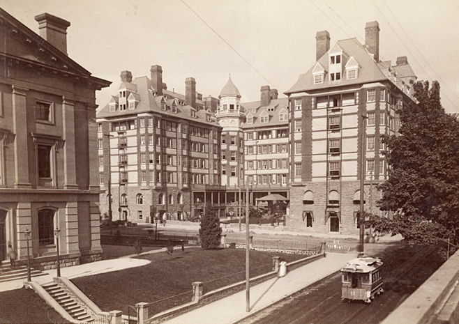 To accommodate weary transcontinental passengers, Villard envisioned a large, elegant hotel, but local businessmen were reluctant to undertake the venture. In 1882, Villard directed the Northern Pacific to begin construction of the Portland Hotel, designed by McKim, Mead & White, on a site immediately west of the federal building (today’s Pioneer Courthouse). When Villard was forced to relinquish the presidency of the Northern Pacific, construction was stopped, and the raw foundations stood for several years until a syndicate of Portland business leaders paid for the work to resume.