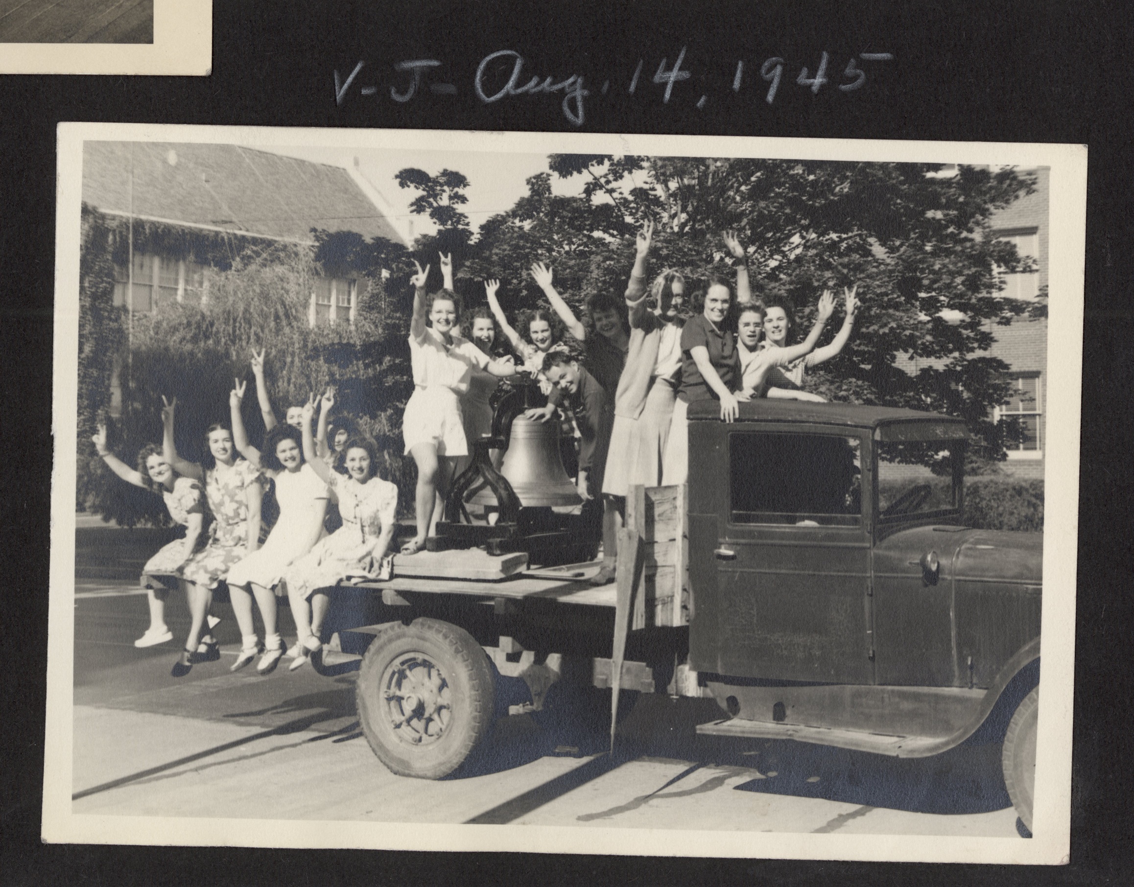 Students join the Monmouth community in ringing the bell on VJ Day, August 15, 1945.