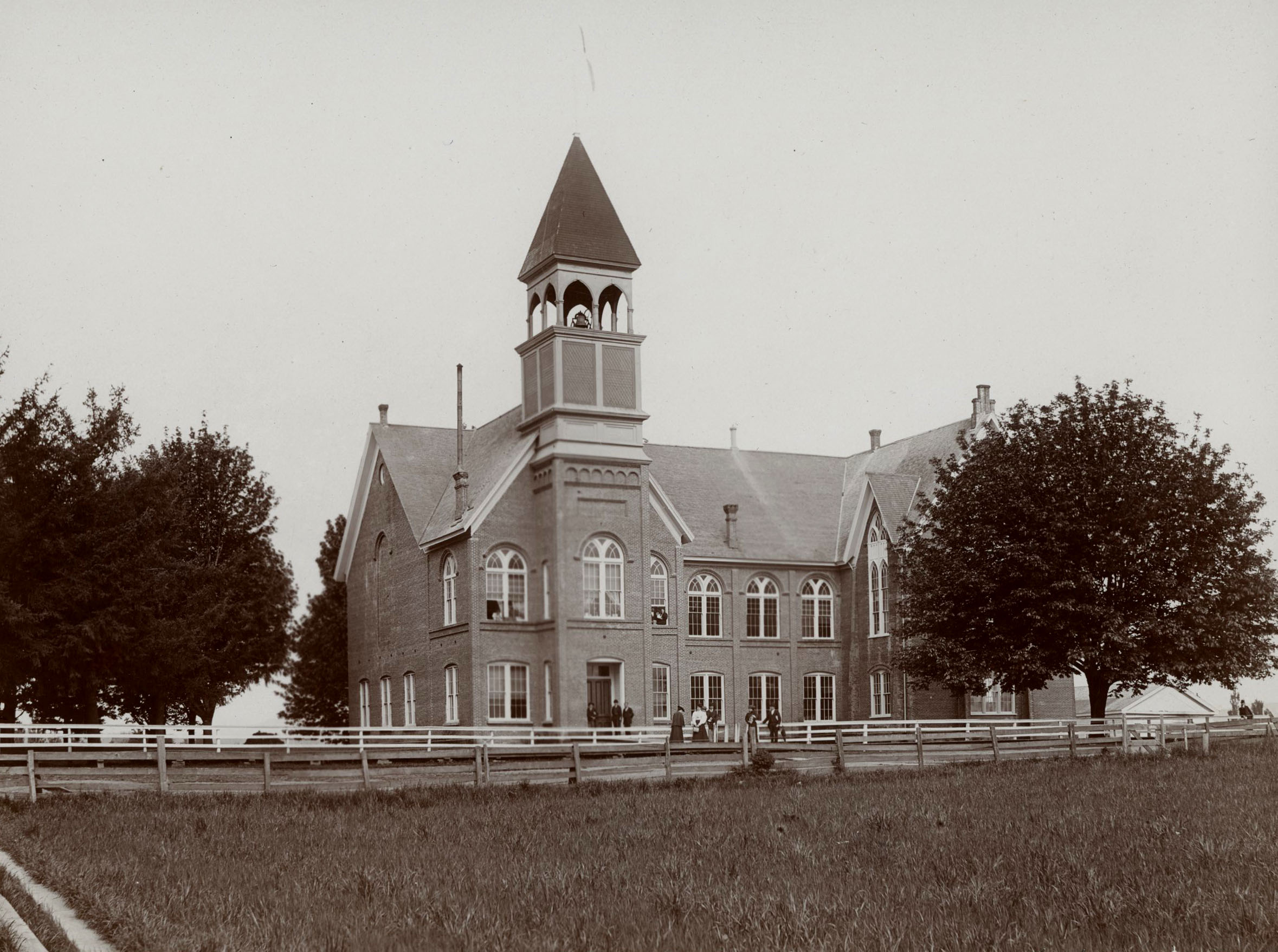 Other Disciples of Christ members had founded Bethel Institute in 1856 for the liberal arts in the nearby community of Zena. By 1865, church members could no longer support multiple schools in the area, so Monmouth University merged with Bethel to become Christian College, with Levi L. Rowland as president. When Thomas Franklin Campbell was named the school’s second president in 1869, the Christian College board of trustees directed him to raise funds for a university building. A Gothic Revival style structure, later named Campbell Hall, was constructed in 1871 from local clay bricks; it is the oldest building on Oregon’s public university campuses. Campbell Hall was patterned after buildings at Bethany College in West Virginia, where President Campbell studied.