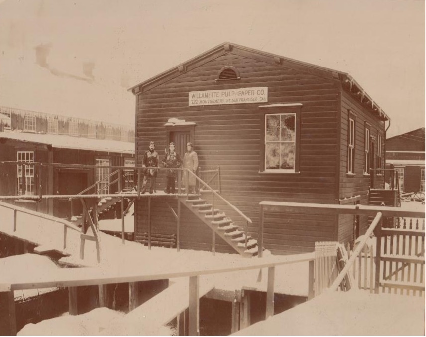 From Oregon’s earliest settlement, the effort to harness the power of the Willamette Falls for industrial purposes has played a role in the development of the state. In October 1866, the Oregon City Paper Manufacturing Company (also referred to as the Pioneer Paper Manufacturing Company) established a mill on the east bank of the Willamette to process wood into pulp and make paper, but that operation ended in debt within a year. Despite the company’s failure, the waterpower of the falls and the plentiful trees from nearby forests were an irresistible combination for papermaking.