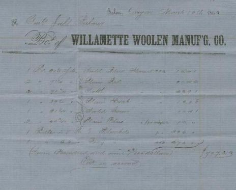 Duplicate invoice from Willamette Woolen Manufacturing Co., March 16, 1860.