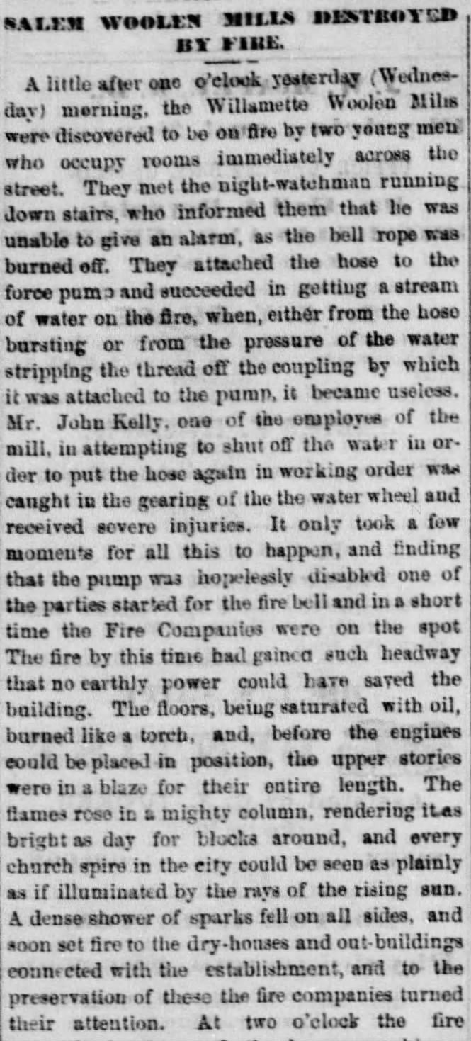"Salem Woolen Mills Destroyed By Fire," Weekly Oregon Statesman, May 5, 1876.